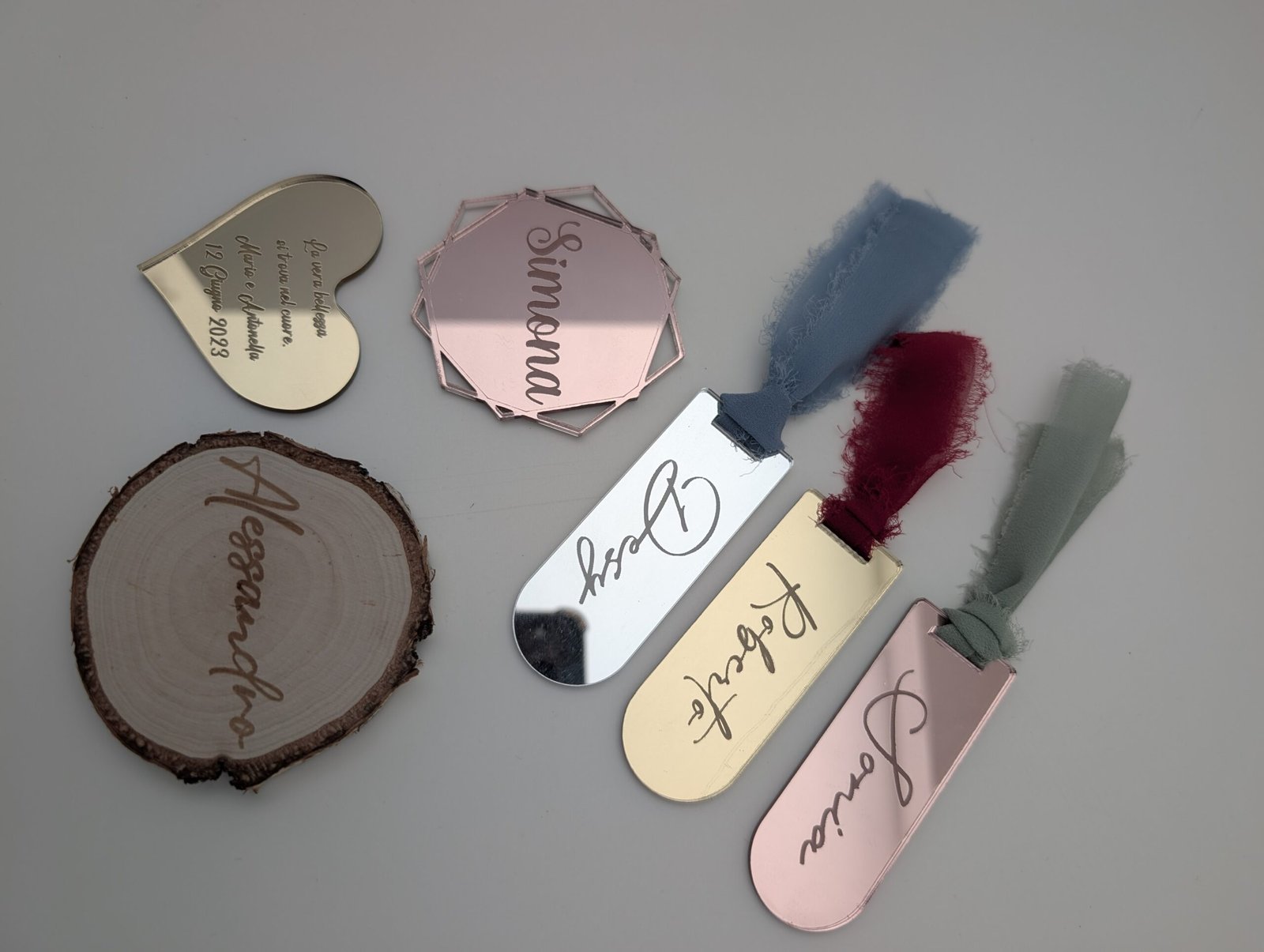 Piccoli dettagli che fanno la differenza: i segnaposto sono personalizzati con incisioni di nomi o iniziali, ideali per stupire gli ospiti e valorizzare la tavola. Disponibili in diverse forme e finiture, si trasformano anche in ricordo da conservare.